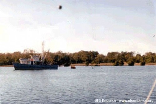 Summary: “We were on our yacht, moored at the marina near Burnett Heads. “It was about mid morning last year, during winter. The TAFE training vessel was out on the water with a lot of people on it. They were obviously doing a practise run on how to jump into a life raft; about six at a time were jumping in at a time. “So I was taking photos thinking this was an interesting exercise that you don’t see often. My husband and I probably took five photos or so over an hour during their training. “When we got the photos back one had a round thing in the picture that we couldn’t explain! “Before this photo, I had never seen UFOs. I must say that now my mind is open to the idea of a UFO,” said Elaine. “I’ve shown lots of people who said it must have been a spot on the lens or the negative, but none of the other photos had it, and it doesn’t look like a mark or a spot, it’s quite round,” she said.