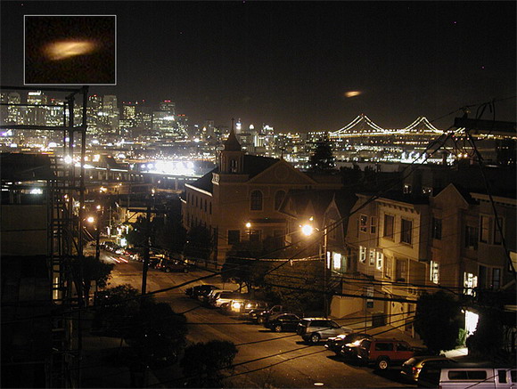 Summary: I was visiting a friend in SF . when i entered his apartment i was taken back by the beautiful view of Downtown SF and The Bay Bridge. I went and grabbed my camera and took a series of pics of the view…since i travel with my laptop i was able to download the pics of my camera right away to take a look at the pics…when they opened up we saw a glowing disc like shape in the first four photos and then gone in the fifth…it seemed to be wobbling and then heads toward the bridge and disappears..when i took the photos i saw nothing…My friend and i laughed thinking it was a reflection or something..we spent the next hour however trying to figure out what it was then..we even thought it might have been a reflection of my partners cigarette…I took another series of pics and tried to duplicate the phenomenon but was unable to. WE giggled about it for sometime thinking wow..what if it is some kind of UFO…i still have no idea, even blowing it up gives no clues of what it is..i took some other photos of inner light reflections from the room, but when you blow them up you can see the lamp or the cigarette. ITs obvious.this just didn’t seem to be that. it was absolutely outside…maybe someone else saw it out there…