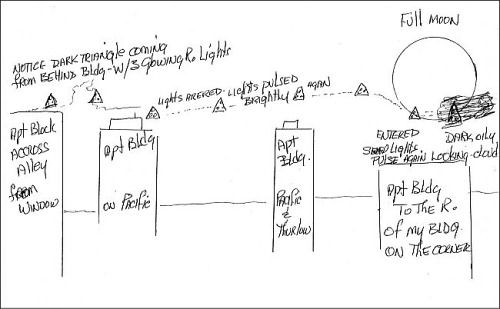 Summary: I WITNESSED A Dark Triangle, with 3 soft RED lights at each of its points, which, (for whatever reason) would suddenly pulse brightly. It came up from behind the top of the apartment building across the alley and traveled over the course of the sighting left to right. This TRIANGLE was moving through the sky point up. There was no noise as I watched this Dark Triangle move slowly from the EAST to the WEST. If I had to describe its movements, I would say it was meandered, slowly with no seeming purpose.