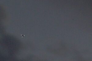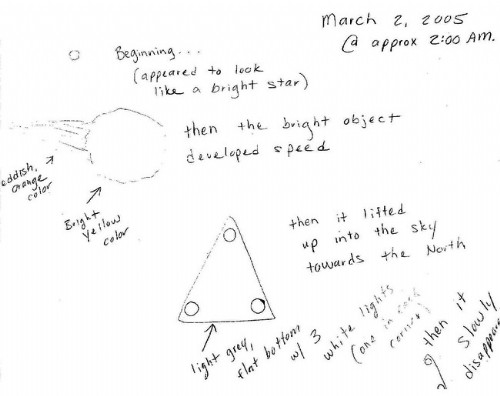 Summary: My co-worker’s 13-year old son was in his back yard in Westwego, LA, taking a picture of the sunset on 04 Mar 05. When he downloaded his pictures to his computer he noticed a spot in the top center of the photo (first photo). When you enlarge the area you see a triangle with lights on each tip (second photo). If you look even closer, you can see a black dot to the right and above the triangle (close-up of this in third photo). Westwego is directly across the Mississippi River from New Orleans. Maybe Art’s visitors got tired of the great southwest and decided to visit the “City That Care Forgot”. With a parade almost every week and all of the unique and colorful people in the French Quarter, an alien, no mater what he looks like could mingle with the crowds unnoticed and fit right in.