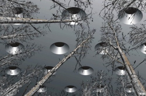 Ricky Sorrells saw the sky replaced by a “barn tin grey” and flat metal embedded with cone-shaped holes as far as he could see – “at least three football field lengths (1,000 feet).” Each cone-shaped hole was separated from the others by an estimated 40 feet; each cone-shaped hole was about 6 feet in diameter and 6 to 8 feet deep. Computer illustrationbased on Ricky Sorrells’ sketches © 2008 by Gregory Watters (Credit and copyright: coasttocoastam.com and also earthfiles.com and Linda Moulton Howe)