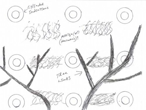 Ricky Sorrells drew for Earthfiles his perspective looking up through the trees on his property at a “tin barn grey” metal emitting “mirage heat waves” and embedded with cone-shaped holes he thought were equally separated by forty feet over the entire surface of the aerial craft above him. Ricky judged that the aerial craft was 300 feet above him and the trees. He also estimated the surface diameter of the cones was about six feet, tapering another six to eight feet down into a cone-shaped hole that ended in a three-foot-diameter circle. Below is a drawing focused on one of the cone-shaped holes. Drawings © 2008 by Ricky Sorrells for Earthfiles.com. (Credit and Copyright: Earthfiles.com and Linda Moulton Howe.)