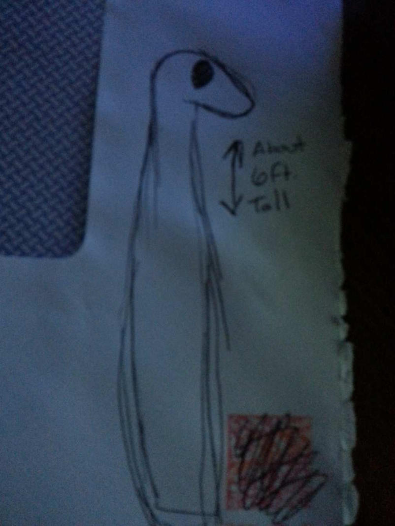 At the foot of the bed was a black colored entity scanning the room with what the witness thinks was a ‘flashlight’. At first she thought it was an intruder (human) but when she saw its head he realized that it was not a ‘human head’. It had a long jaw and a big round black eye (seen in side view). It was scanning the room as if looking for something or someone, but it wasn’t moving it was just standing there. Upon seeing the creature the startled witness must have made a noise since the creature flashed the light towards her and temporarily blinded her. She couldn’t open her eyes, no matter how hard she tried. Obviously frightened she attempted to wake her aunt who was sleeping next to her but was unable to. After about 30 seconds or a minute the light disappeared, she was then able to open her eyes again and there was no one there anymore. Very frightened her first reaction was to check if her son was still next to her, which he was. She held him tighter, got under the covers and went back to bed.