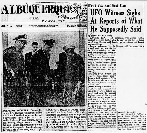Lonnie Zamora, Socorro police officer, was pursuing a speeder just south of town 50 years ago, on April 24, 1964 at 5:45 pm. He reportedly heard a roar from a distant and decided to quit his pursuit of a speeding vehicle and went to a place where he heard a loud sound. He knew there was a nearby dynamite shack, so he suspected that was the source of the noise.