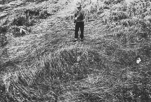 He dismounted from his swather (a mowing machine) and approached the object on foot. As he drew near, he noted that the object was a symmetrical bun shape and that it was hovering about a foot off the ground. He noted also that the grass underneath was being imparted a clockwise swirling motion. While watching for about two minutes from a distance of 15 feet, he noticed that “the whole thing was turning.” Returning to the swather, he noted four additional identical objects to his left. He sat motionless for about 15 minutes and watched. He said he wanted to leave but couldn’t (the inference here is that he was too terrified to operate the controls of his swather properly). After about 15 minutes, the objects all left simultaneously moving straight up. They exhibited a grey mist underneath and “a strong downwind.”
